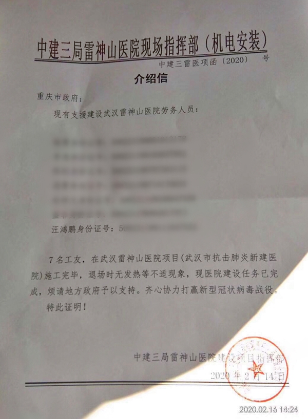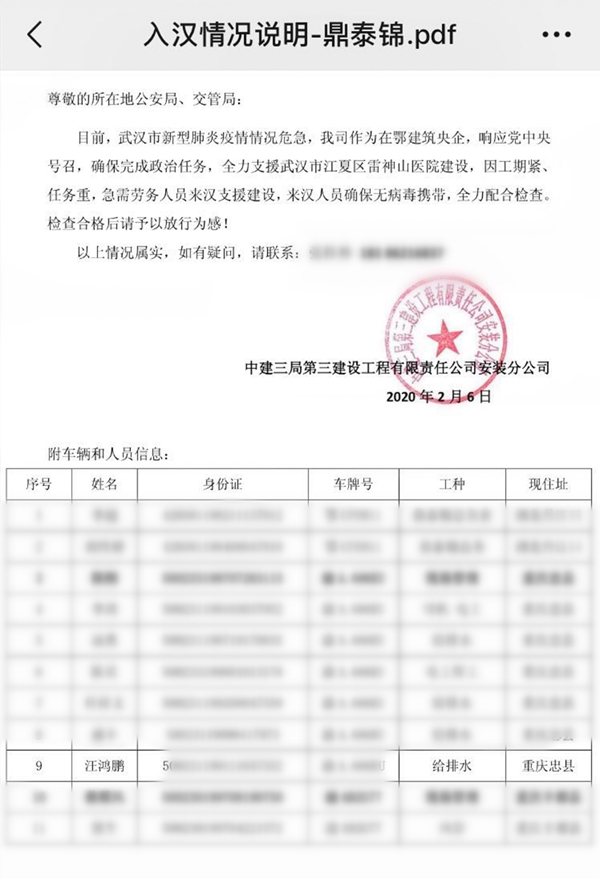 “你娃吃‘独食’索,有‘好事’也不叫上我们”更让汪鸿鹏想不到的是,他所在项目的支部书记、项目经理杨强不知从哪里得知了他去武汉的消息。“我这里已经联系了3个人了,你们那里到底还差不差人?如果差我们可以马上过来,办通行证的事你得行不?”杨强书记追问道,“领导你来晚了一步,现在暂不缺人了,放心,不得给十一建丢脸!” 汪鸿鹏调侃道,其实他真正担心的是项目一旦复工,杨强经理因为返渝后的14天隔离观察可能会影响项目部工作。