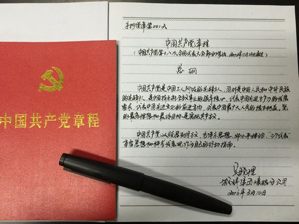 “学党章党规、学系列讲话,做合格党员”学习教育,是继党的群众路线教育实践活动、“三严三实”专题教育之后,中央提出的面相全体党员从集中性教育向经常性教育延伸的一项重要举措。“两学一做”,基础在学,关键在做。城建集团开展此次“手抄党章100天”活动,旨在通过引导广大党员职工逐条逐句学习党章,全面理解党的纲领,牢记入党誓词和党的宗旨,牢记党员义务和权利,尊崇党章、遵守党章、维护党章,坚定理想信念,对党绝对忠诚,做“忠诚、干净、担当”的合格党员。
