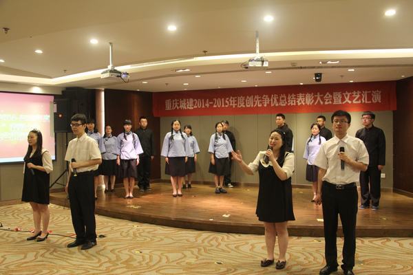 表彰大会后,还进行了重温入党誓词和为城建集团青年志愿者服务总队授旗环节。随着文艺汇演的正式开始,来自集团机关和各分公司的职工们以多种形式的表演为“7・1”建党日献礼。