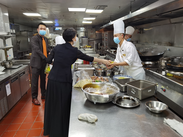 酒店管理层一行来到员工餐厅、中西厨房、洗衣房、户外岗亭、锅炉房、物业处等岗位点,看望了在高温下仍然坚守一线的维景员工,给大家送去了凉茶、玄麦甘菊颗粒、板蓝根等慰问品。领导们详细询问了员工的工作情况,细心嘱咐他们在高温下劳作要注意劳逸结合,做好劳动保护和防暑降温,合理避开高温时段,确保身体健康。