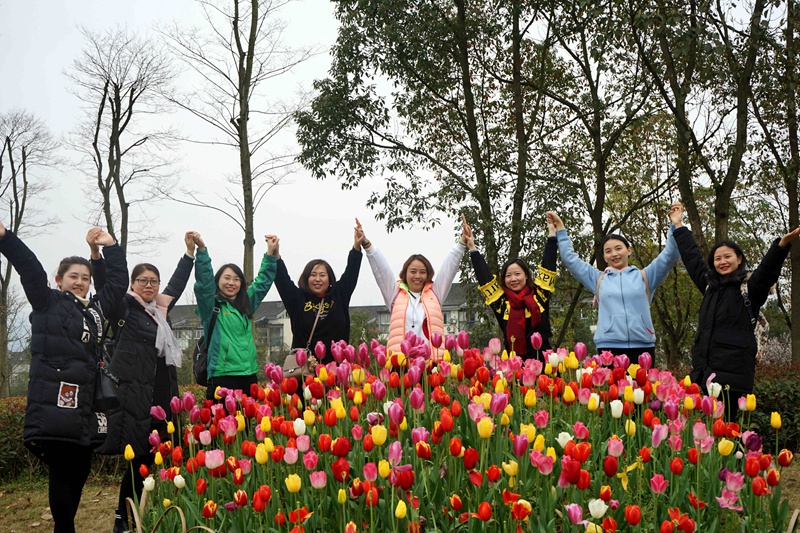 走在“人生”路上,处处都有美好的风景,关键是需要我们去发觉。脚边有嫩嫩的青草,散发着淡淡的雨后泥土的清香;身边有五颜六色的花朵,有的含苞欲放,有的吐露芬芳,个个都争着展露枝头;远处早已“干枯”的树枝上,竟然密密麻麻的点缀了绿色的“宝石”,生机无限。公司的姑娘们怎么能放过展示自己的机会,三三两两一组,或在草地上,或在花丛间,有的排个一字,有的组个千手观音,不论年龄与否,都是“卖萌”高手……真是女人如花,花似梦!