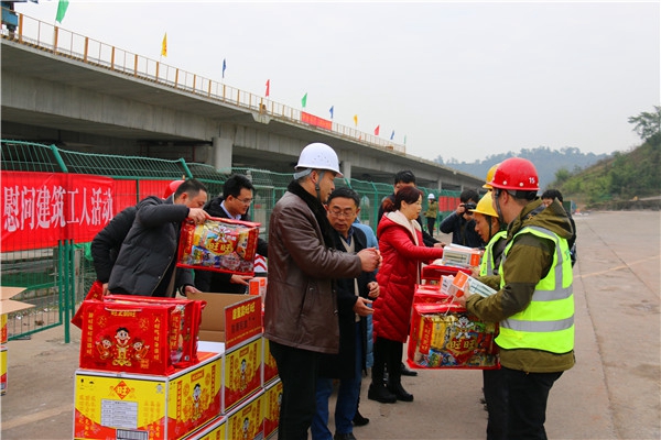 1月17日,九龙坡区政府办公室、区总工会、区人社局、区住房和城乡建设委员会等相关领导对华岩隧道西延伸段二标项目部的农民工开展慰问活动。慰问组一行来到项目部,深入工地,给农民工送去党和政府的关怀和新春祝福,并对50名农民工进行慰问,发放了慰问品。