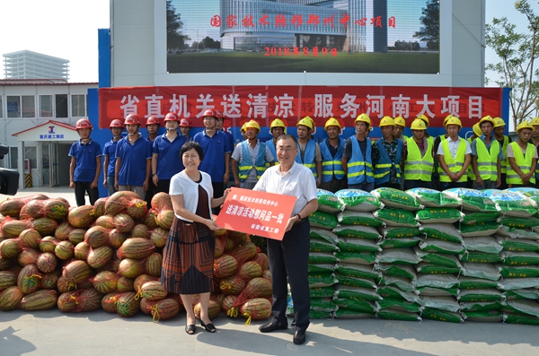 8月9日下午,河南省委省直工委副书记范晓音、省科技厅副厅长夏培臣、省重点项目办副主任周晓辉、省发改委机关党委副书记王保安、省直工会主任桑文理一行来到了由伟德体育市政一公司承建的国家技术转移郑州中心项目,将准备好的绿豆、西瓜、防暑降温药品等清凉慰问品送到了一线参战人员手中,并进行慰问。体现了河南省直机关对重点工程施工一线的关怀,在炎炎夏日给参战人员带来一丝惬意、一缕清凉。