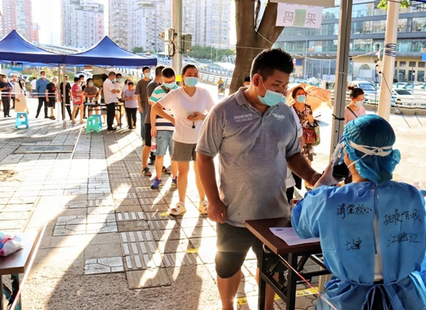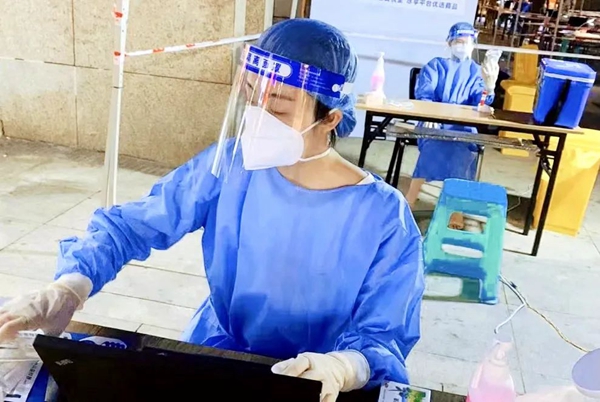 七建志愿者冒着高温酷暑协助社区居民进行核酸检测