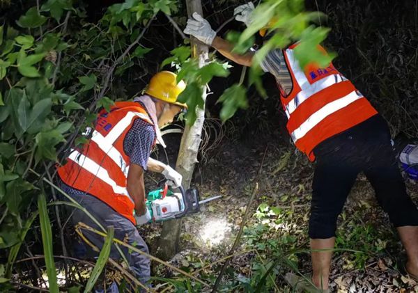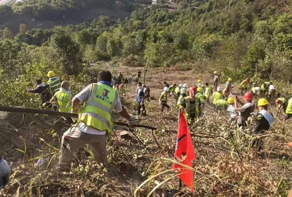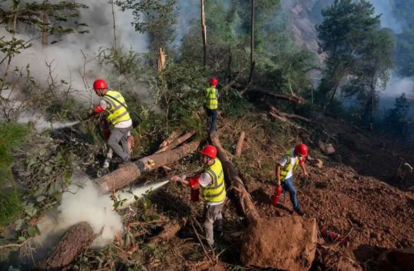 在北碚区缙云山火场,三建公司组建应急救援队开展砍伐隔离带和巡山工作