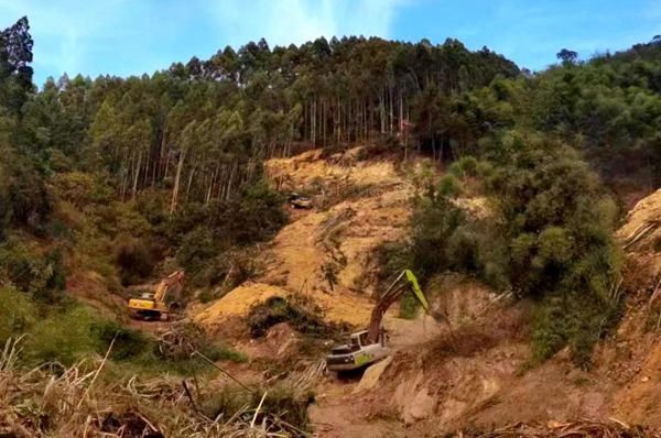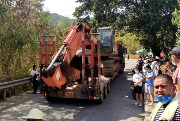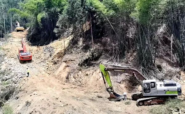 在北碚区缙云山火场,八建公司组建突击队紧急调集两台挖掘机参与现场灭火