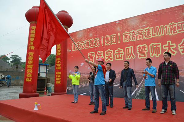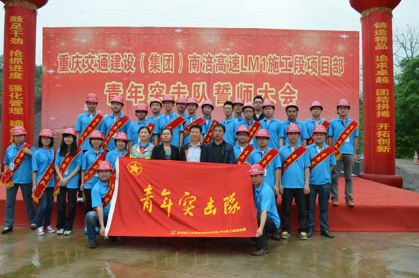 交建集团一直重视青年队伍在一线施工中的突击队作用,5月25日,交建集团在南涪高速路LM7―1项目部举行了青年突击队誓师大会。交建集团党委副书记、纪委书记、工会主席吴晓渝,团委书记支启恒、浩正公路园林公司董事长向兵、党支部副书记李小红等出席了此会并作了重要讲话,现场举行了青年突击队代表宣誓和向青年突击队授旗仪式。