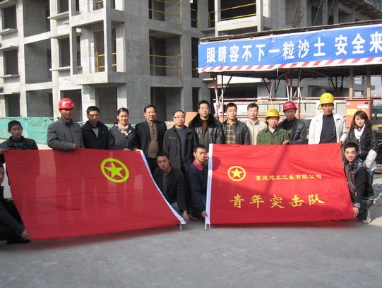 “民心佳园”公租房位于北部新区鸳鸯奥特莱斯以南地块,是重庆市首个公共租赁住房项目,土建事业部公租房项目部承建的二期C-1#、C-2#、C-3#楼于去年11月15日开始建设,预计全部完工时间为今年7月中旬,为优质高效的完成该项工程,对树立公司良好形象、决胜房屋建筑市场起着重要作用。授旗仪式上,项目经理李峻介绍了工程概况和青年突击队组成情况,并表示将以此为契机,进一步把青年突击队竞赛、岗位练兵等活动引向深入。公司纪委书记、工会主席廖兴明为青年突击队授旗,突击队队长康陶接过队旗,带领青年突击队全体队员宣誓,号召广大团员青年积极行动起来,紧张有序地开展青年突击队竞赛活动,以饱满的热情、昂扬的斗志,投身于项目工作中,抢抓机遇,再立新功。公司董事长、党委书记程世龙希望大家继续发扬前期艰苦奋斗的精神,优质、高效、安全、快速地完成工程建设任务,誓把公租房项目工程打造成时代的精品,树立工业公司良好形象。