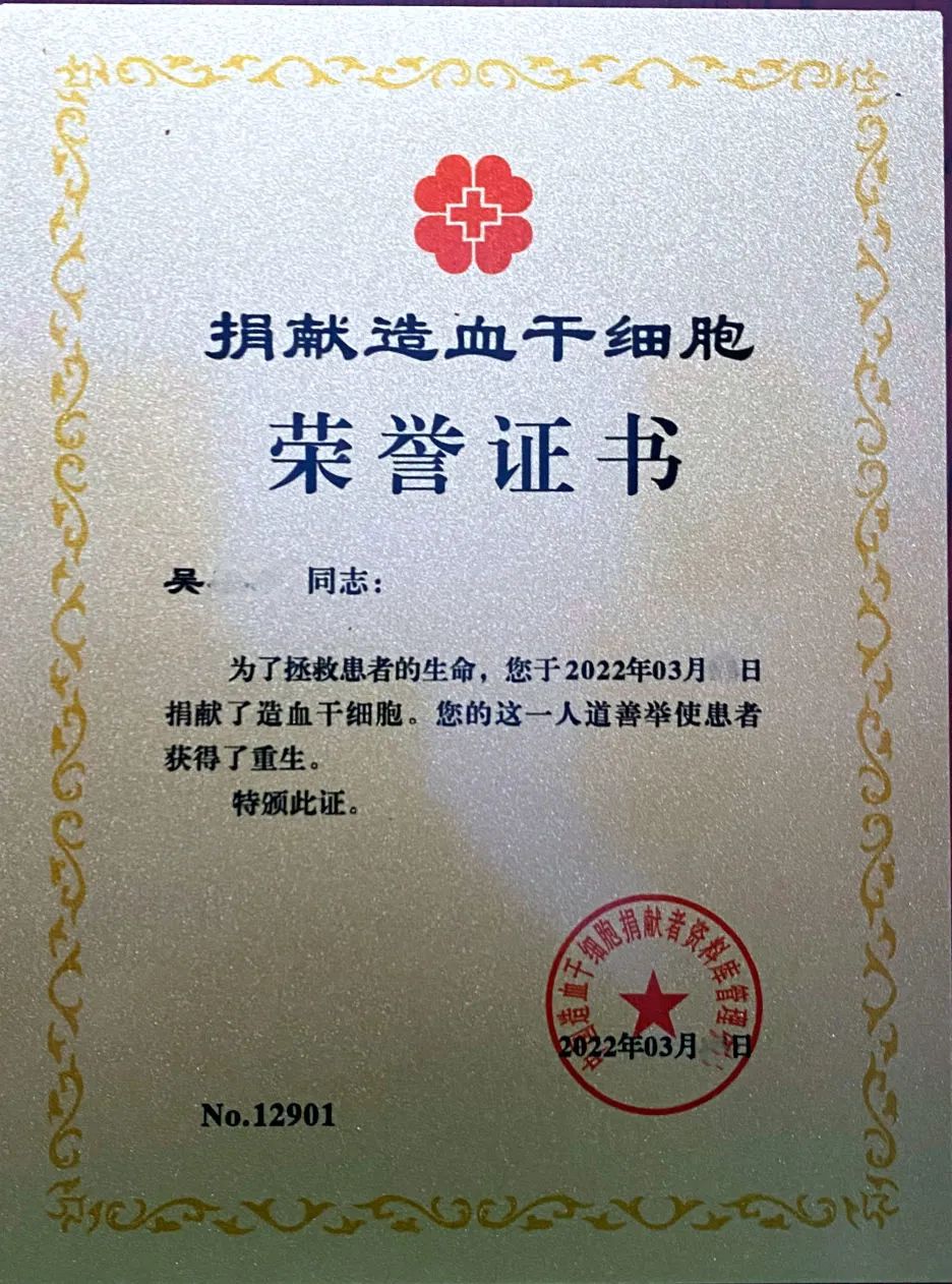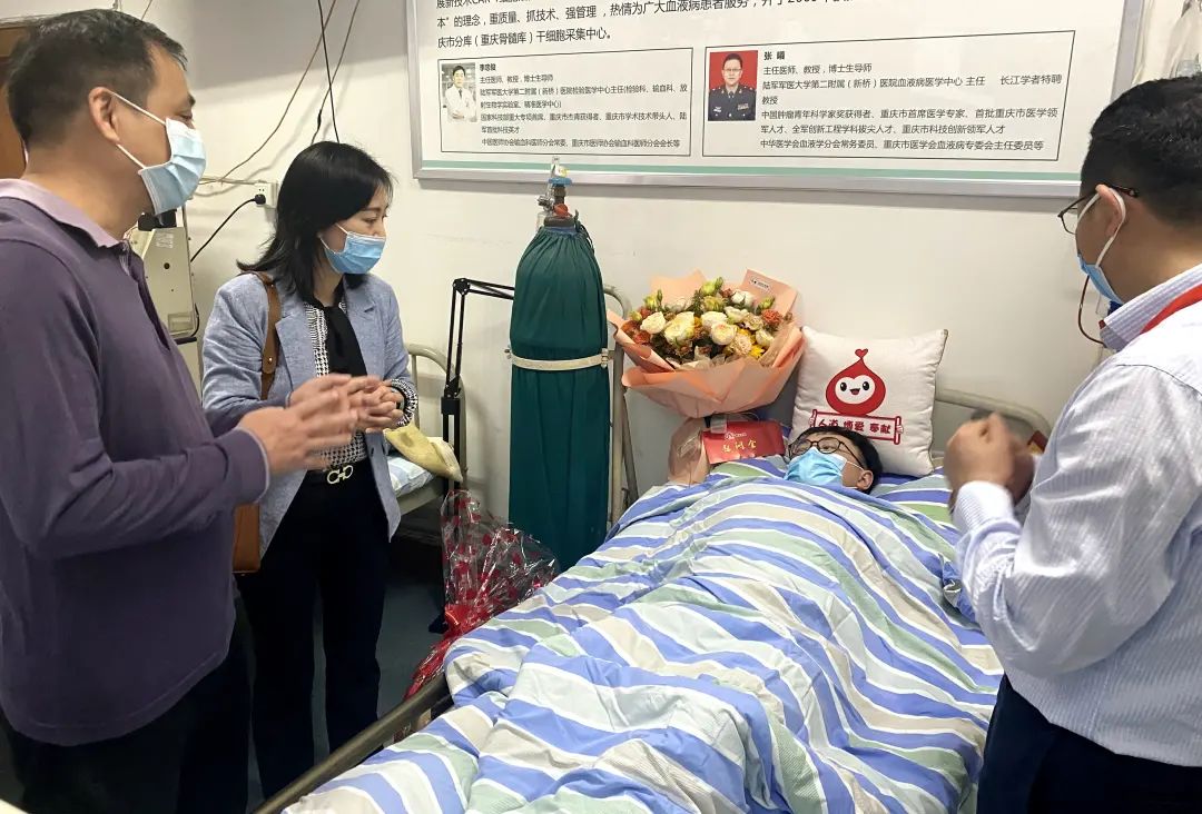 重庆市造血干细胞捐献者资料库管理中心主任周学跃现场为吴迁伟颁发了“捐献造血干细胞荣誉证书”,并代表被捐献者感谢他的爱心善举。经过4个小时的采集,从吴迁伟体内分离出了约200毫升造血干细胞混悬液,工作人员将用最快速度送往患者所在医院。