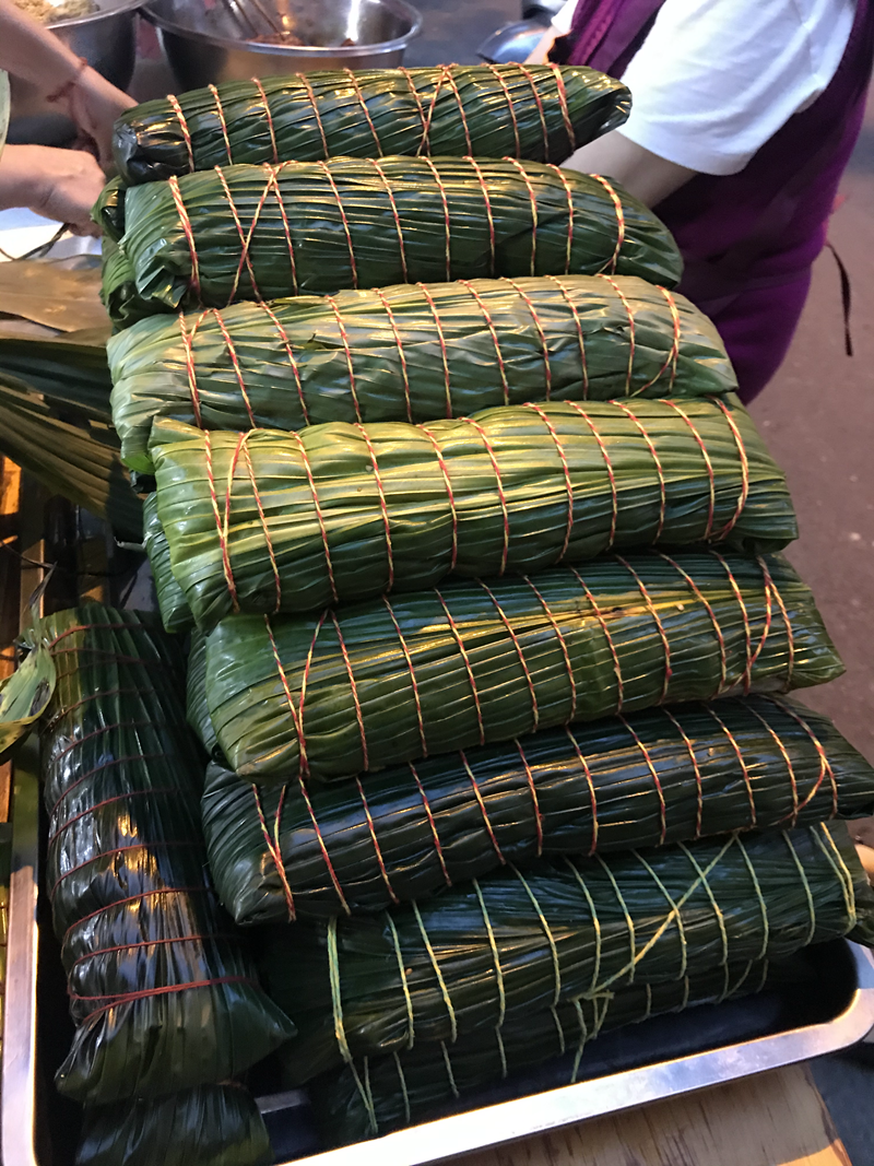 距离端午节还有十多天,浓厚的节日氛围充盈了整条街,各位“婆婆”的拿手粽子纷纷亮相。碎米芽菜粽、蛋黄鲜肉粽、香菇鲜肉粽、排骨粽、红烧肉粽、牛肉粽……除了粽子,还有咸蛋、皮蛋等端午民俗食品。路边随处可以见到手工粽技艺,五六张细窄的芦竹叶层层相叠,叶片左右交叉便卷成圆锥形的喇叭状,再填入晶莹剔透的糯米直至身形饱满,五色丝线麻利一绕,一个菱角状的粽子便出现在手间。灵巧的双手在眼花缭乱间就包出了一串大小、形状一模一样的粽子。各式各样的粽子,琳琅满目,令人目不暇接。成都马鞍路的街面上,树影下支满了粽子摊位,一眼望不到头。微风过后,粽香四溢,人声鼎沸中,平日里沉寂的小街一下子充满了活力。