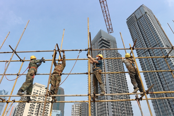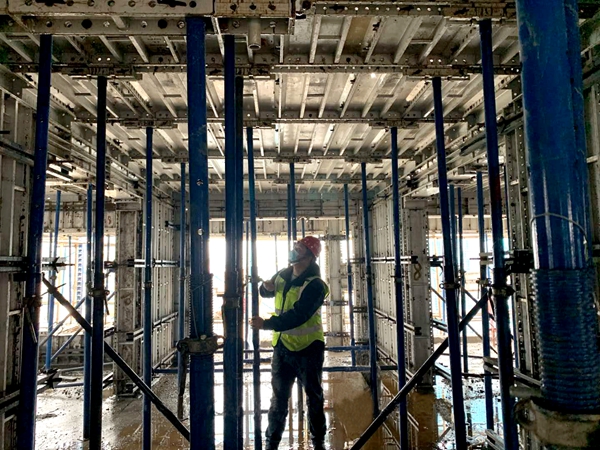 4月24日上午,三建江津佳兆业项目技术人员正在检查支撑架体稳定性