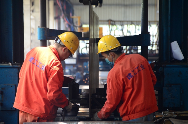 4月2日,工业公司钢结构车间里,一线工人正在组立重庆市璧山区胶轮有轨电车工程项目的H型钢