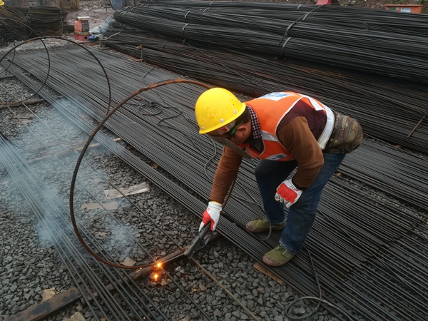 4月23日,十一建公司武警鸳鸯项目钢筋电焊工正在进行焊接作业