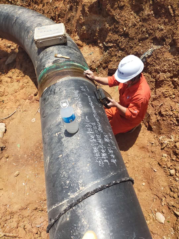 4月23日,安装集团无损检测公司广州天然气利用工程项目部的项目负责人正在用数字式超声波探伤仪对管道焊接口进行超声波检测