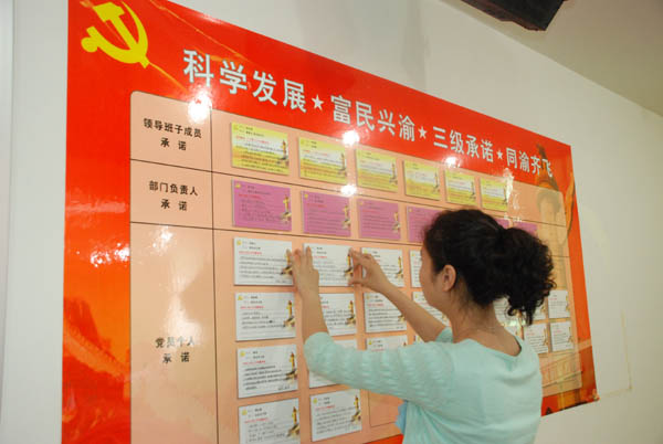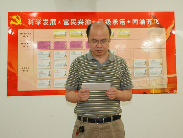会议围绕市党代会提出的“科学发展 富民兴渝”总体任务目标,开展了一场“ 三级承诺同渝齐飞”主题承诺活动(即领导向集团和广大职工承诺、部门负责人及党员个人分别向公司承诺)。该司领导班子成员、部门负责人、党员个人依次结合自身工作实际填写了承诺卡,并在承诺墙下作出郑重承诺。该司希望通过“三级亮承诺”活动的开展,使使全司党员干部在学习领会党代会精神的同时,紧密结合工作实际,为进一步加快推进集团“六大工程建设”,担负新使命、抢抓新机遇、作出新贡献。