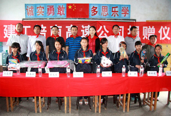捐款仪式上,涪南公司党支部书记、副总经理刘国强,鸭江镇副镇长湛斌,双河园小学校长廖新建分别在仪式上致辞。刘国强谈到:涪南公司在建设南涪路的过程中,得到了沿线地方政府和群众的大力支持和帮助,作为国有企业,我们承载着更多的社会责任,为回报沿线群众的支持,公司特别组织了这次捐资助学活动,希望能尽我们的绵薄之力支持沿线地区教育事业的发展,让孩子们健康快乐地成长,早日成为国家的栋梁。湛镇长和廖校长对涪南公司捐资助学、奉献爱心的善举表示衷心的感谢和由衷的敬意,并表示将充分利用好这批物资,让它们真正为孩子们的健康快乐成长发挥重要的作用。