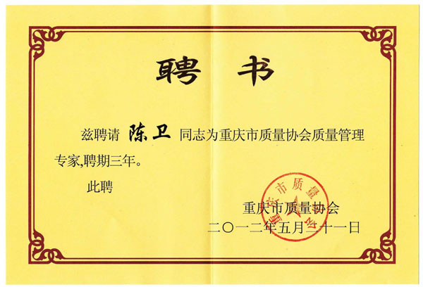 5月21日,重庆市质量协会在渝通宾馆召开了2012年重庆市质量工作会。会上,安装集团工程技术部质量责任工程师陈卫被聘为重庆市质量协会质量管理专家。聘期三年。