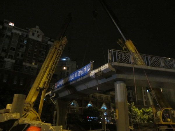 14日晚10点,伴随着轰鸣的吊车声响起,拆除施工正式启动。项目部各岗位人员齐齐就位、各负其责,在经过了8个小时紧张有序的工作后,虎头岩、柏林天桥平稳地从5米高的桥桩上拆除下来,这一难度最大的拆除任务宣告圆满完成。