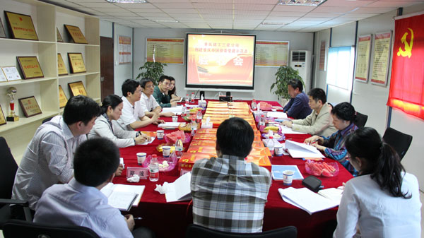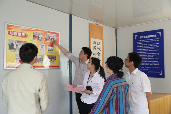 检查组一行在该司领导陪同下,先行参观了项目农民工文化艺术陈列室、农民工夜校、宿舍、亲情房等地方。随后,在项目会议室,杨帆董事长介绍了公司党建工作开展情况。他指出该司党建工作的三条思路:一是要围绕“把方向、当助手、做管家、谋实惠、促和谐”五个方面切实开展工作,为生产经营工作保驾护航;二是要坚持制度创新、管理创新、科技创新和企业文化创新,为企业发展增添活力;三是要以人才培养为重点,为公司快速发展提供强大的智力支撑。 CBD项目经理邓宏、支部书记杨君分别对项目情况及项目党建工作作了介绍。