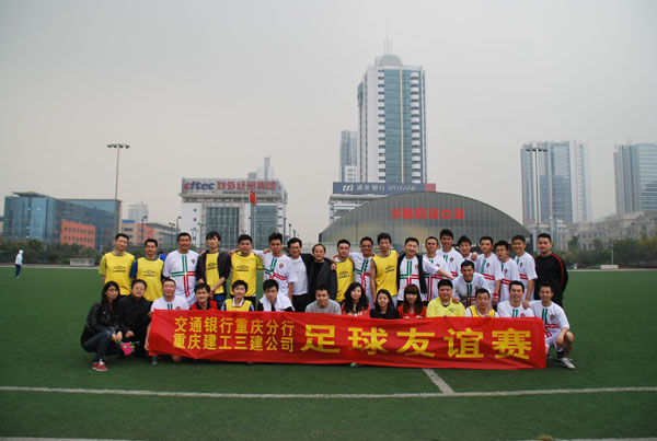为进一步加强与合作单位的沟通交流,丰富青年团员的文化生活,4月7日下午,集团三建公司团委组织公司足球队与交通银行重庆市分行足球队在渝北中华坊体育场举行了一场别开生面的足球友谊赛。交通银行重庆市两江新区支行行长宋军、该司财务总监陈尚毅等领导亲自到场为球赛指导、助威。