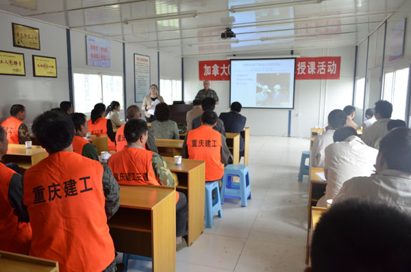 三建公司江北嘴金融城2号项目是中国和加拿大合作的农民工职业卫生与安全示范项目,中加合作办公室每年会定期组织两次中加双方专家到项目交流学习,本次交流以加方专家Ross授课的方式进行。参加专题讲座的还有中加班主任雷权平,三建公司工程管理一部经理石世东,副经理蒋勇,资深经理陈厚安。