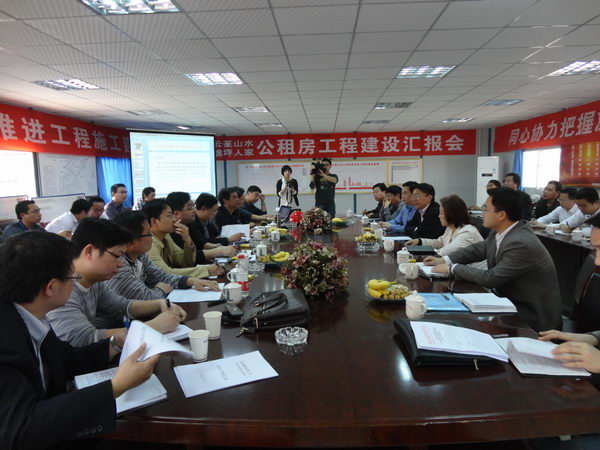 会议首先由集团龙州湾公租房项目执行总经理白瑞华汇报工程建设情况。本工程自开工以来受到市建委、巴南区委区政府各部门及城投公司的大力支持。结合本工程特点及实际情况,集团在质量、进度上对项目经理部实行项目管理总部和组团经理部两级管理模式,目前已进入大规模主体施工的阶段,计划八月份全面封顶。