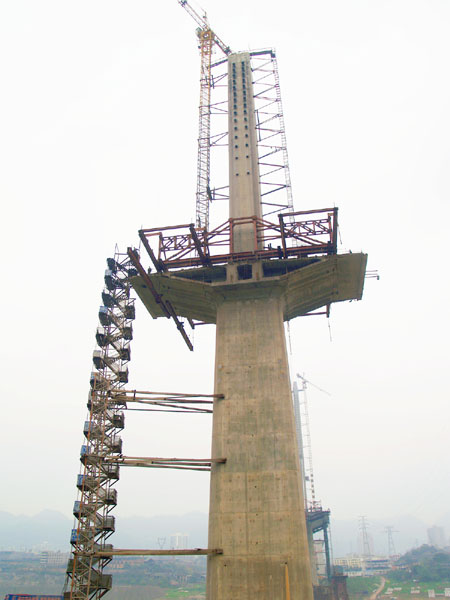 挂篮安装是目前该司大桥施工过程中遇到的一项高技术含量的工作。如何把重达260吨的挂篮吊上57米高的主墩,便是一项难题。为解决这一困难,经市政一公司项目经理、技术总工及现场管理人员研究决定,将2台10吨卷扬机、4台40吨三门滑车组以及4台10吨单门滑车分别设在墩底和墩顶,利用滑轮原理,把每件数吨重的挂篮配件依次吊上0号块,并进行拼装。近日,该司已将重达60多吨的弧形梁吊装到位。