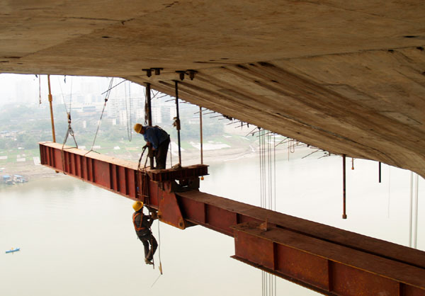 斜拉大桥的混凝土梁,通常利用悬臂挂篮进行浇筑。即建好0号块(主墩墩顶梁段)以后,分别在两头安装钢构挂篮,为搭建模板、现浇混凝土的施工提供足够大的作业面。从1月10日起,市政一公司双碑大桥项目部便组建小分队,专攻主塔的挂篮安装。