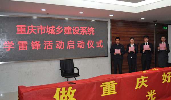今年3月5日是毛泽东同志号召向雷锋同志学习49周年纪念日,根据十七届六中全会提出的深入开展学习雷锋活动和市委召开学习雷锋动员大会的精神,市城乡建设委员会举行了学雷锋活动启动仪式,号召建设系统所有员工学习雷锋同志崇高的理想、坚定的信念。党员干部代表、窗口单位代表、企业劳模代表、行业协会代表共同宣读了《争当雷锋传人,争做重庆好人――建设系统“学雷锋、树新风”活动倡议书》,号召大家共同学习“奉献、友爱、互助、进步”的雷锋精神,积极投入到学雷锋活动中来,为建设“美丽新重庆”而努力。
