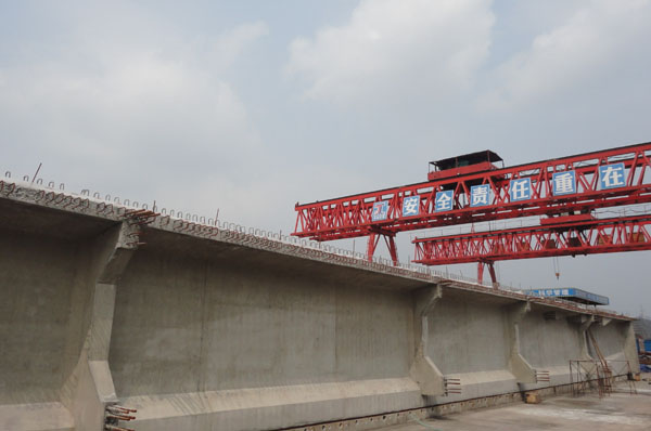 此次预制T型梁长40米,梁高2.8米,如此大跨度T梁在全重庆市市政工程中实属少有。为确保预制梁的顺利进行,项目部全体参建人员积极准备,周密部署,多次针对T梁砼浇筑过程中的重点、难点进行分析,并对作业班组进行技术交底,梁场技术人员仔细复核施工工艺、砼的施工配合比等情况,确保预制梁达到最佳预制状态。