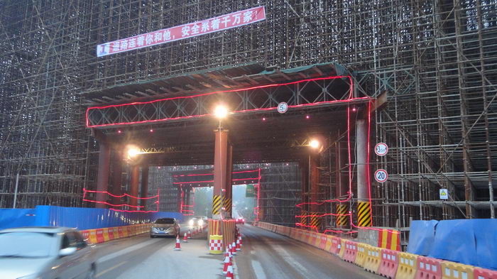 由伟德体育市政二公司承建的黄桷湾立交工程,由于多条桥梁支架体系跨越了现有内环高速路、盘龙立交上、下匝道,弹广路、腾黄大道等交通点,形成了多个跨线施工门洞,交通安全风险较大。受“重庆九公里轻轨12.19门架垮塌事故”警示,黄桷湾立交工程项目部把加强现场跨线支架安全设施视为了当务之急。