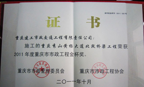 12月20日,在刚结束的重庆市市政工程协会2011年年会暨表彰会上传来喜讯,由市政交通公司四项目部承建的秀山黄杨大道北段桥梁工程,荣获2011年度重庆市市政工程“金杯奖”称号。值得一提的是,该工程是四项目部转型以来承建的第一个大型市政工程,也是酉阳秀山地区获得的第一个市政“金杯奖”,提高了公司乃至建工集团在偏远地区的企业知名度。