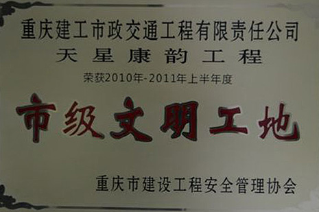 日前,根据文明工地验评标准,经重庆市创建文明工地领导小组评审验收通过,由市政交通公司承建的沙区“天星康韵”住宅工程荣获市级文明工地称号。