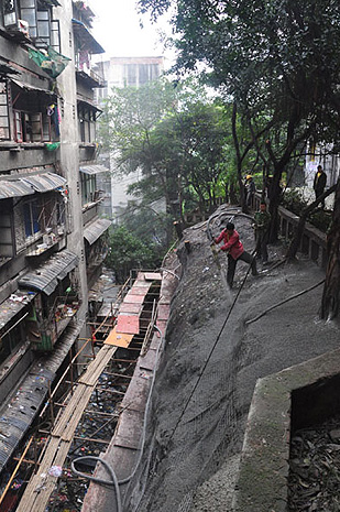 近日,石坪桥社区五一新村40幢居民楼下来了一辆混泥土搅拌机,有近10位工人在居民楼后面的堡坎上施工,他们搭支架、牵防护网、搅拌混凝土,紧张而有序的工作着。