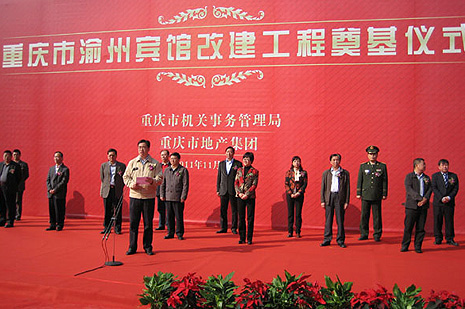 最后,重庆市副市长谭栖伟郑重宣布:重庆市渝州宾馆改扩建工程开工!在欢快优美的乐曲声中,在礼仪小姐的引领下,出席工程奠基仪式的相关领导到奠基石前,手握铁锹为该工程掀土奠基,标志着该项工程建设的序幕正式拉开。