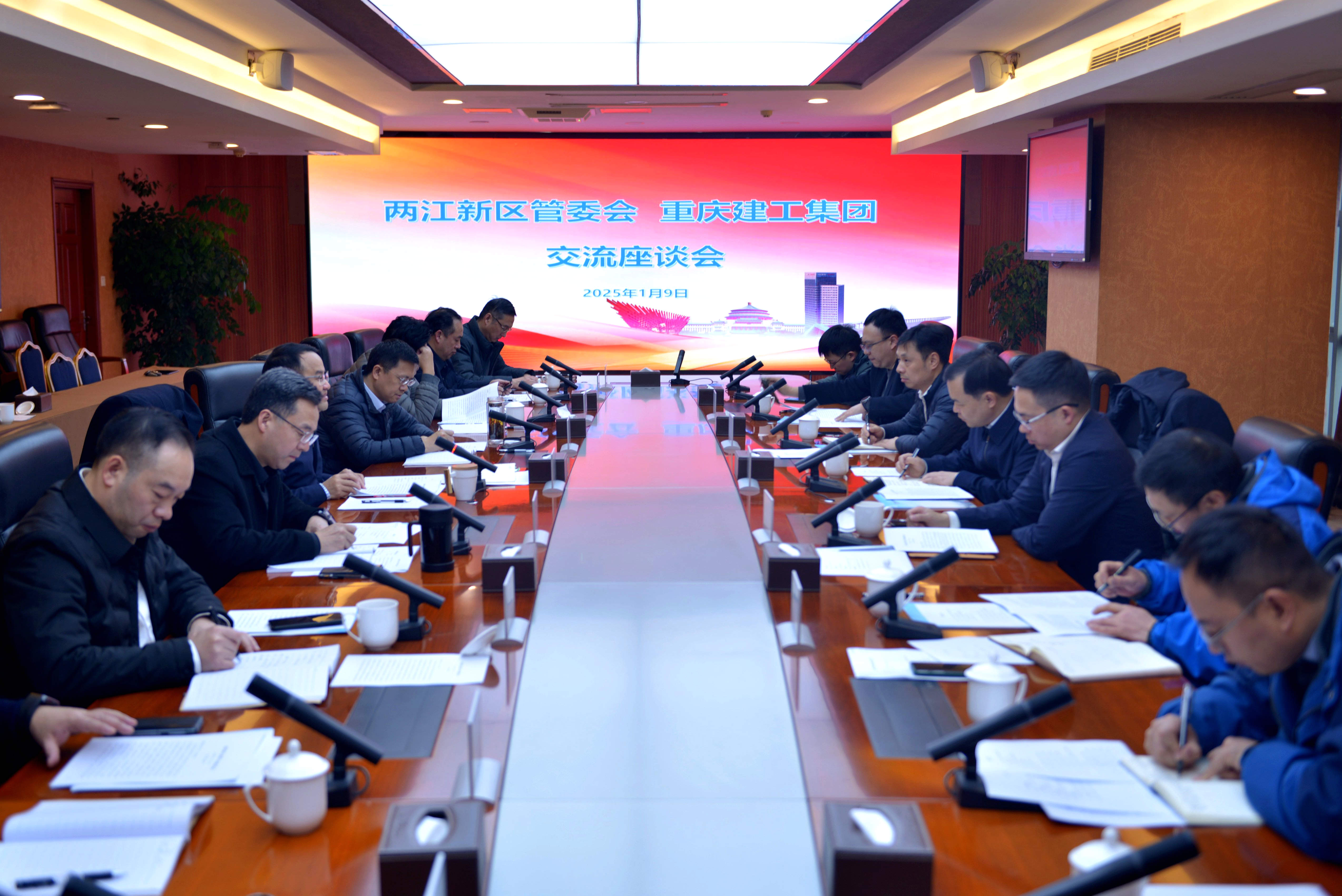 1月9日,集团党委书记、董事长孙立东和党委副书记、总经理周进在建工产业大厦与两江新区管委会党工委委员、管委会副主任郑博文一行,就进一步加强区企合作、共促发展进行深入交流座谈。两江投资集团副总经理高锋,集团副总经理夏煦、程亮参加。