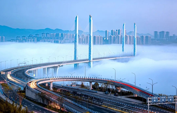 该项目是重庆市连接两江新区和西部(重庆)科学城的“三桥一隧”的控制性工程之一,南接礼嘉片区金山寺立交,横跨嘉陵江,北接蔡家片区代家院子立交,大桥全长约1442米,主桥为双塔双索面斜拉桥,双边肋主梁宽度在国内同类型桥梁中排名第一。大桥于2021年9月通车,它的成功通车打通了蔡家片区、大学城等新兴区域的发展瓶颈,加快畅通城市交通血脉,对重庆建成内陆开放高地,促进成渝地区双城经济圈一体化发展,加速渝西地区设施互联互通具有重要意义。在施工过程中,城建集团大力实施智能化管理为项目建设赋能增速,广泛采用BIM技术优化施工设计、提高施工质量、缩短工期降低成本。截至目前,该工程已斩获2023年中国市政工程最高质量水平评价和4项市级奖项。