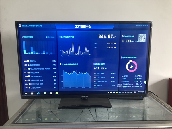 近日,高新建材公司推进使用的构件信息化管理系统有了新进展,产线可视化大屏看板正式投入使用,本系统由云端实时导入生产数据并计算汇总,远程投放至大屏智能电视,利用可视化数据,实时掌控生产动态,成为管理者直观了解车间近况的驾驶舱。