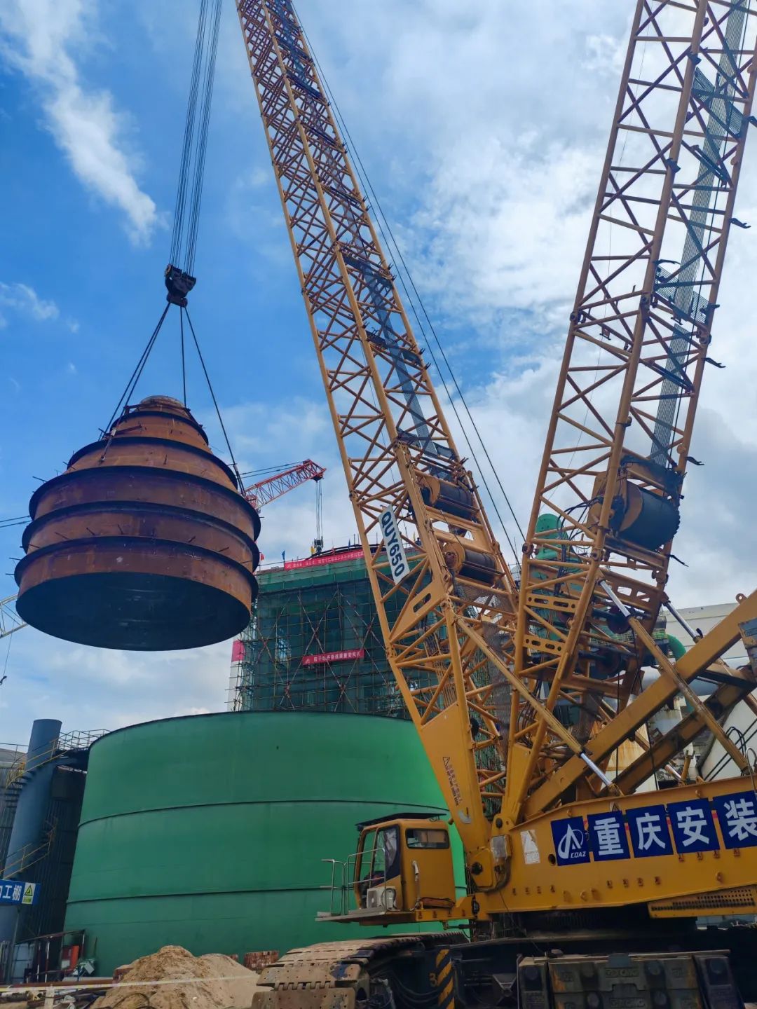 同时,项目部安排650吨的履带式起重机将150吨重的蒸发罐上段精准吊装至预定位置时,20余名工人以最短时间完成了组对点焊,安全、高效、精准地完成了安装任务。通过一系列技术手段,项目部成功将复合板焊接合格率由常规情况下的92%提升至97%以上。