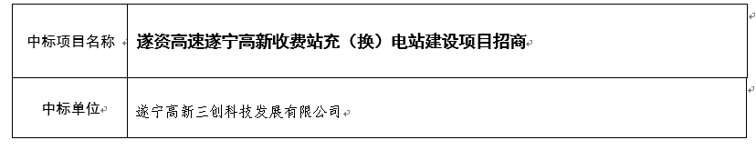 遂资高速遂宁高新收费站充(换)电站建设项目招商招标公示期(2023年7月11日至2023年7月13日)已满,现将中标结果公告如下: