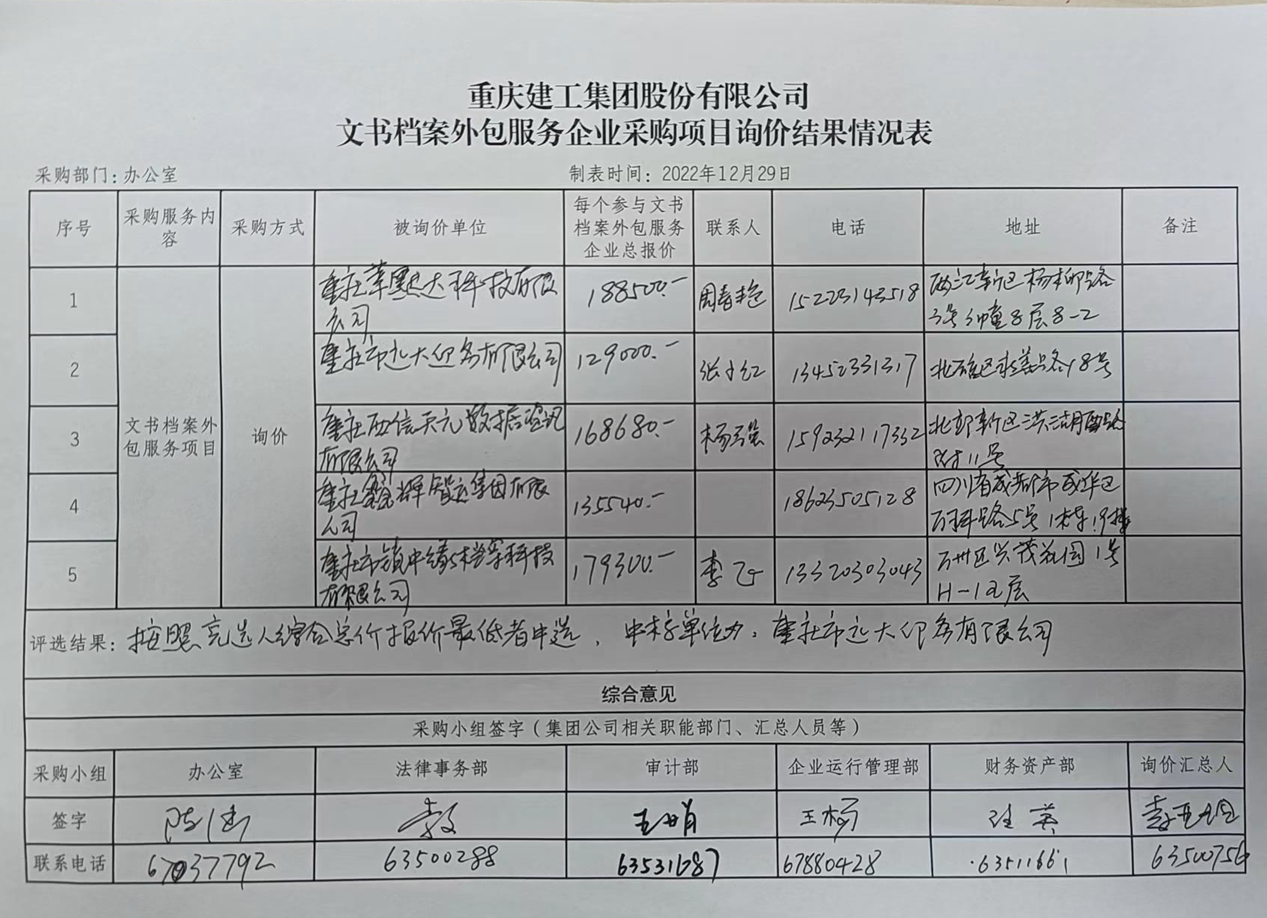 伟德体育集团股份有限公司文书档案外包服务企业采购项目询价结果情况表