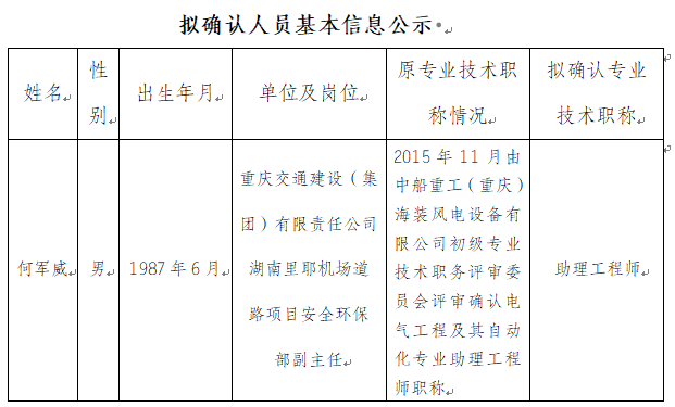 根据《重庆市人力资源和社会保障局关于印发重庆市来渝人员专业技术资格确认办法的通知》(渝人社发﹝2015﹞201号)文件精神,来渝专业技术人员的原专业技术资格,须按规定进行确认。现将重庆交通建设(集团)有限责任公司何军威同志助理工程师任职资格信息予以公示(人员基本信息附后)。公示时间为3个工作日(从2022年10月31日至11月2日止)。