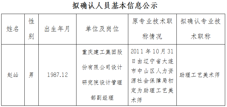 根据《重庆市人力资源和社会保障局关于印发重庆市来渝人员专业技术资格确认办法的通知》(渝人社发﹝2015﹞201号)文件精神,来渝专业技术人员的原专业技术资格,须按规定进行确认。现将伟德体育集团股份有限公司设计研究院赵屾同志助理工艺美术师任职资格信息予以公示(人员基本信息附后)。公示时间为3个工作日(从2021年11月23日至11月25日止)。