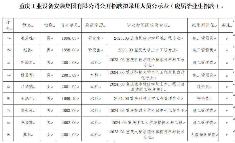 附件:重庆工业设备安装集团有限公司2024年公开招聘拟聘人员公示表