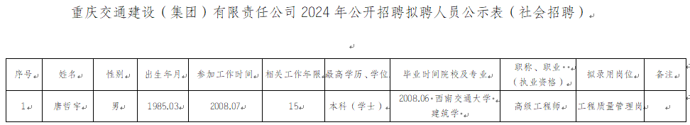 附件:重庆交通建设(集团)有限责任公司2024年公开招聘拟聘人员公示表