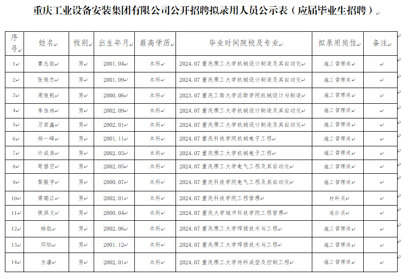 附件:重庆工业设备安装集团有限公司2023年公开招聘拟录用人员公示表