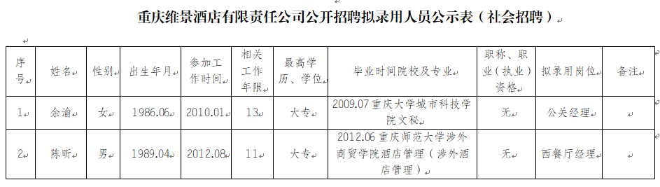 附件:重庆维景酒店有限责任公司2023年公开招聘拟录用人员公示表