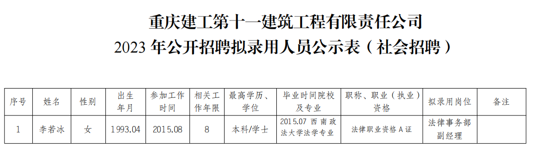 附件:伟德体育第十一建筑工程有限责任公司2023年公开招聘拟录用人员公示表