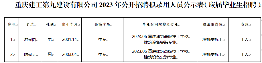 附件:伟德体育第九建设有限公司2023年公开招聘拟录用人员公示表