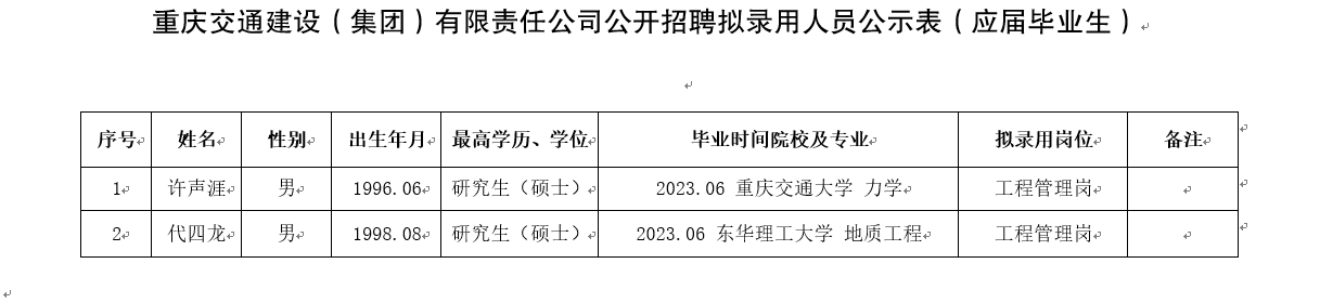 附件:重庆交通建设(集团)有限责任公司2023年公开招聘拟录用人员公示表